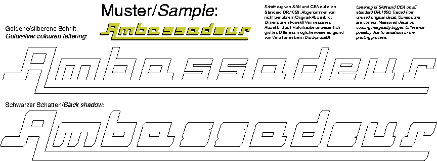 This 'Ambassadeur' logo was used by both SAN and CEA on all standard DR.1050/DR.1051. The source for this is an unused original decal, so both size and colours are correct. The measured size of a decal applied to a cowling is marginally bigger, the reason for this difference perhaps being due to differences in the printing process or aging of the decal. The yellow foreground lettering is gold-coloured on the original decal, and the shadow is black. |