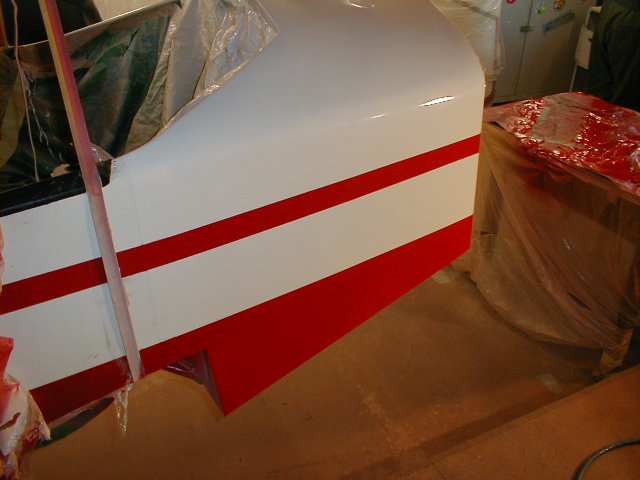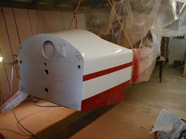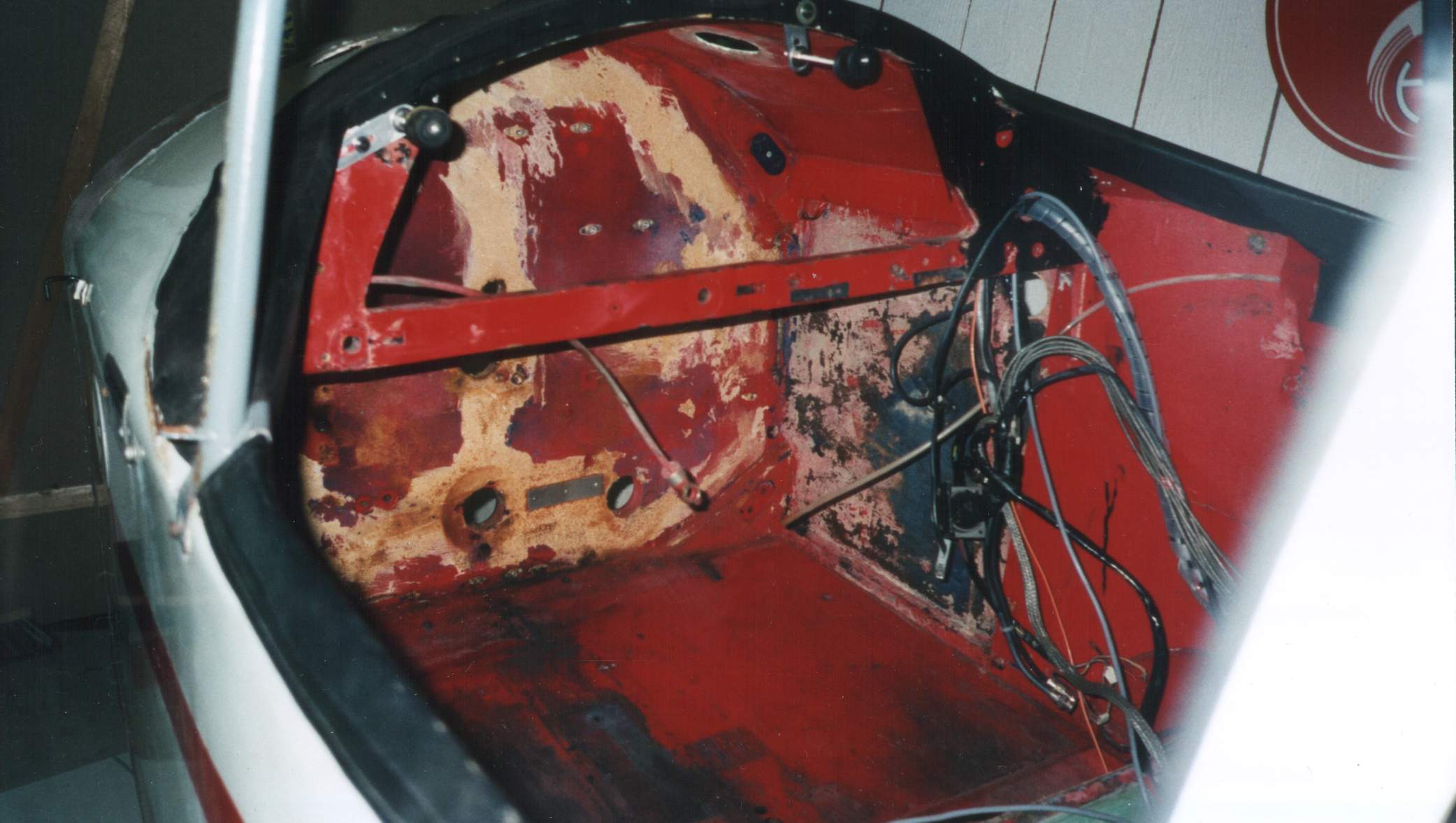 Since arriving in Knittlingen by container, Juliet has been sitting in the barn/shop of Ekke, patiently enduring the repairs. Because the airframe was more or less completely disassembled anyhow, it was decided to use the chance and do a ground up restoration also. The partly burned firewall and the cockpit floor (see pictures 17 to 19) were replaced with new parts by Mr. Huber in Speyer. After that, the fuselage was recovered from the firewall to the door and then painted (see pictures 22 to 24).