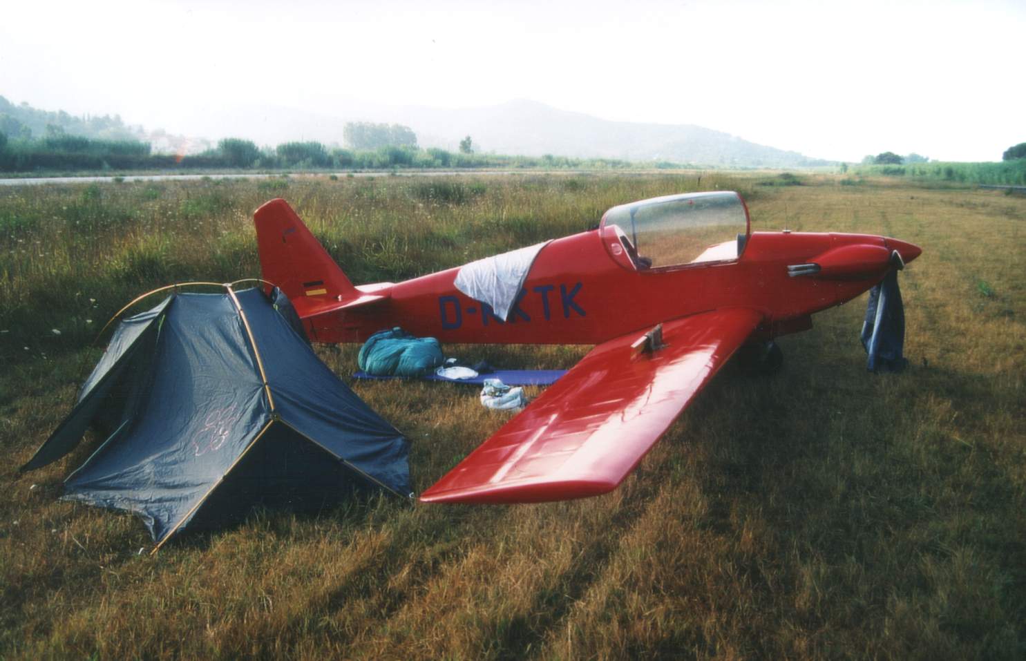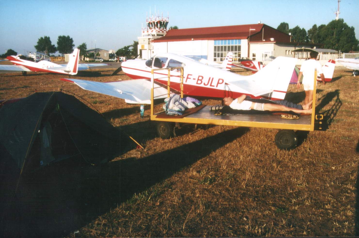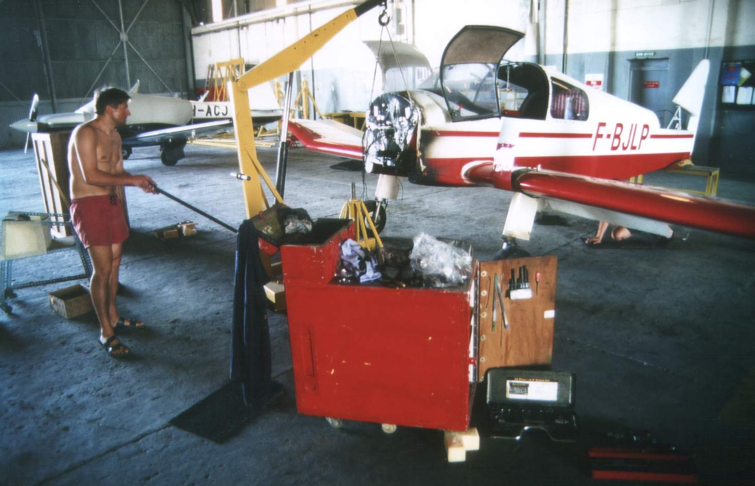 | But back to F-BJLP. With only 50 hours remaining on the engine, something had to be done fast. While being on one of their frequent 'Tours de France', Jö and Ekke discovered a shabby-looking DR.1051 Sicile in a corner of the airport of Andernos near Bordeaux in October of 1995. To make up for the not-so-nice exterior, this aircraft (F-BKHQ, s/n 386) had a rather low-time Potez engine installed. Because of lack of knowledge concerning the ignition system of the Potez, the owners were more than willing to sell the aircraft. After spending only a few minutes to get the engine started for a test flight (under the un-believing eyes of members of her previous owners, a flying club), HQ quickly changed hands for 65.000 FF. After flying her for 50 hours, the aircraft was completely disassembled. During about a week of work at Grenoble, HQ's engine found its way into the nose of Juliet with around 1000 hours since new. There it ran reliably until a dreaded date: July 20, 1998. In the mean time, the remaining parts of HQ were transported to and stored in a corner of Ekke's barn, to be used as replacement parts in case of a mishap or in a future (twin-engine!) homebuilt Jodel. |