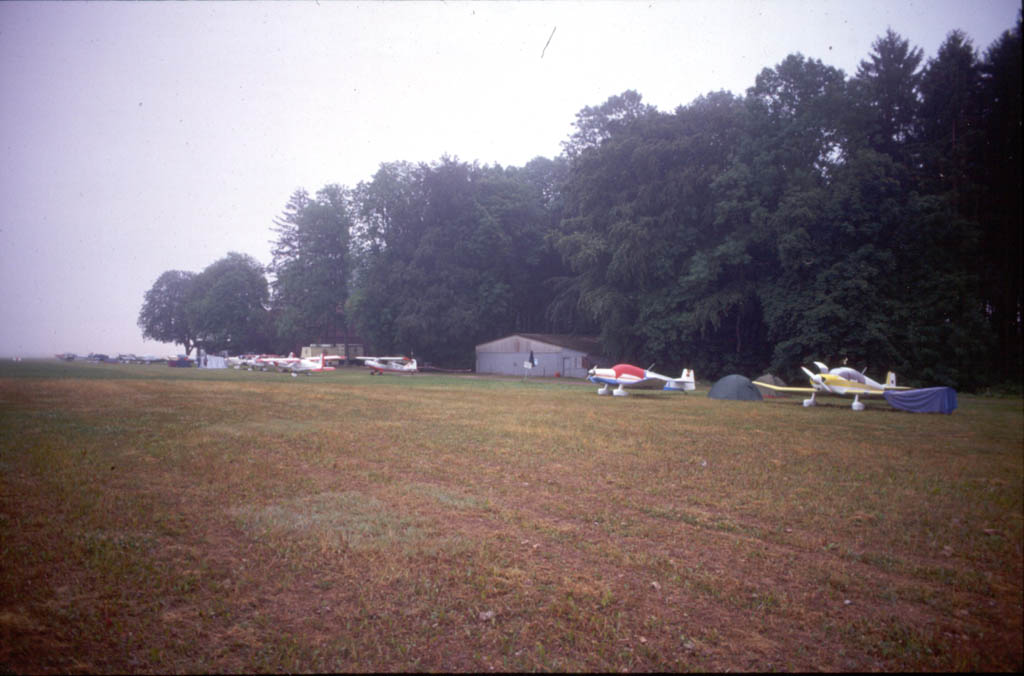 After finally receiving the paperwork completing the sale from the LBA and doing my checkout in Heidi in late June, this was the first Fly-In I attended with Heidi. As usual, I was a bit late in getting under way, so it was already early afternoon when I arrived at Nordenbeck after an approx. 2-hour flight. All the buildings at the airfield are neatly tucked in the forest at the south side of the runway, which is also where the already arrived aircraft were parked. So I didn't recognize the grass runway immediately - only after having flown past it. Both approach ends to the runway are reasonably clear of obstacles and the runway is in fair shape, so the landing was uneventful. Later in the afternoon, the weather had deteriorated very much, and in the evening it started to rain. Therefore most of the aircraft shown in the following pictures have their canopy-covers already donned. This picture, taken next morning, is proof that the weather didn't improve over the night. The low clouds lifted only well past noon. The aircraft visible in this picture are Jodel DR.1050 D-EKMA (s/n 380) with their new owners Stürzel/Schmidt from Kempten and my DR.1050 D-EHIE s/n 291 on the right.