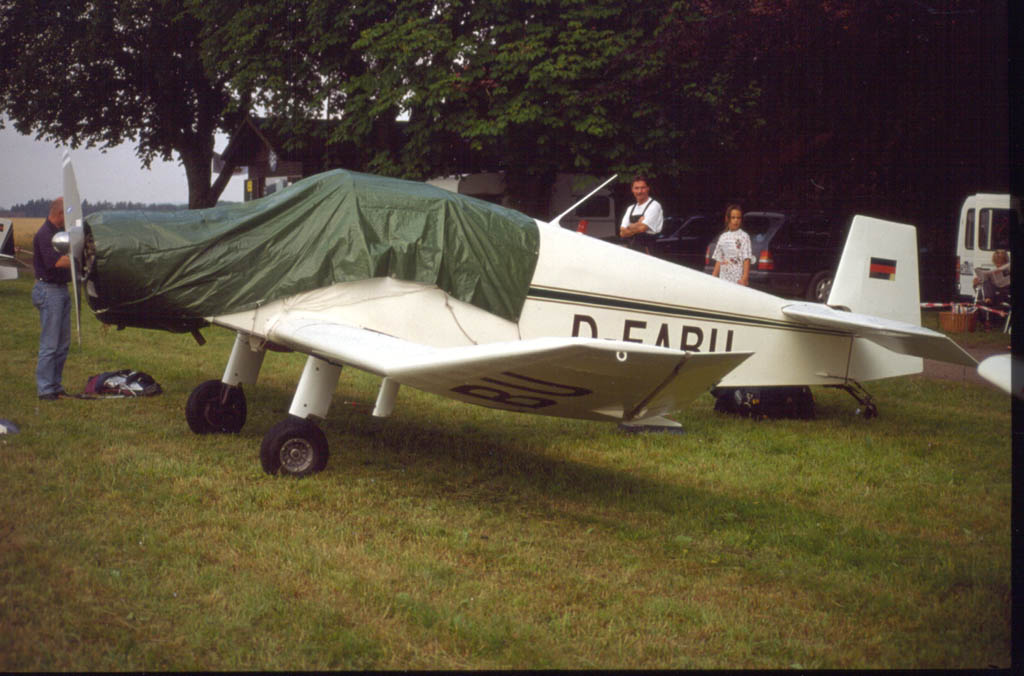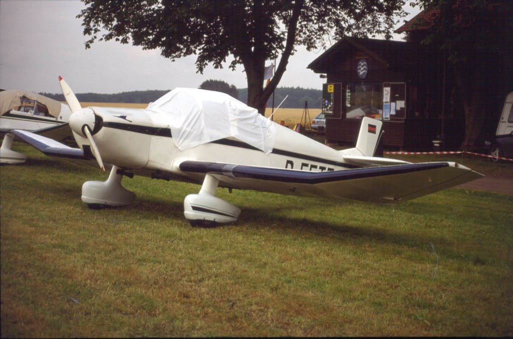 Jodel D.120 D-EABU s/n 205 (ex F-BKCU), owned and restored by Horst Bless. Note the paint scheme similar to Herbert Jösch' Jodel DR.1050 D-EABT, which was also restored by Horst Bless (who is tanding in front of the plane, partially hidden by propeller and cowling).