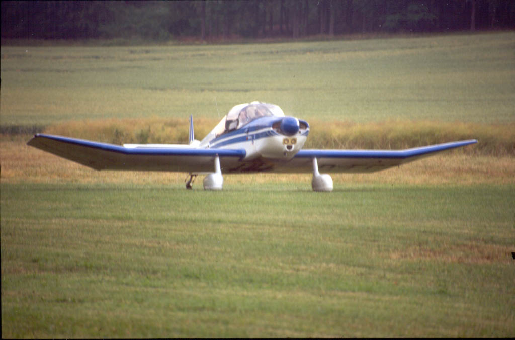 D-ECZC (s/n 28), the Jodel DR.1050 belonging to Fly-In organizer Georg Klein and his partners. Being the third oldest surviving DR.1050 in Germany (first registered 10/1960), this aircraft will undergo a complete restauration in the winter of 2000/2001. Georg Klein, one of the organizers of the Fly-In, and a partner in the aircraft (left person) are standing behind the wing in this picture.